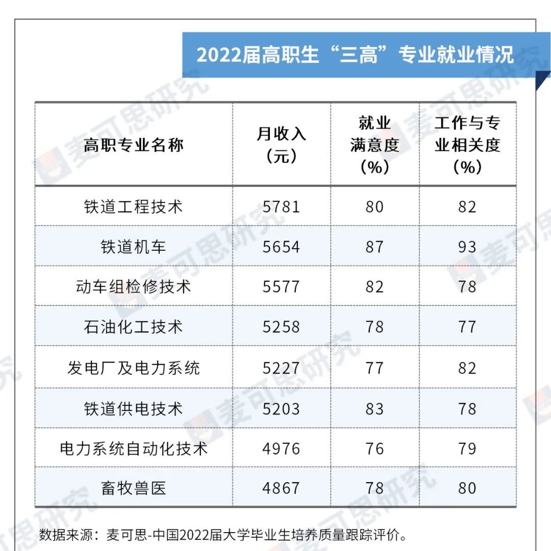 根据《2023年中国高职生就业报告》数据显示,2022届高职生毕业半年后薪资最高的专业是铁道工程技术(5781元),其后依次是铁道交通运营管理(5745元)、铁道机车(5654元)、动车组检修技术(5577元)、机械制造与自动化(5448元)。 从高薪专业所属专业大类看,月收入排名靠前的50个专业主要集中在装备制造大类(15个)、交通运输大类(13个)、电子与信息大类(10个),合计占比超过高职高薪专业Top50的3/4。 除了高薪,对于很多毕业生来说,可能更看重的还有工作的整体体验。数据显示,2022届高职毕业生中,就业满意度最高的3个专业依次是铁道机车(87%)、铁道供电技术(83%)、动车组检修技术(82%)。 从专业大类看,排名靠前的30个专业中,7个属于交通运输大类,其后数量较多的为能源动力与材料大类、农林牧渔大类、土木建筑大类,数量均为3个。 而在月收入、满意度“双高”的专业中,还有部分专业同时拥有较高的工作与专业相关度,比如铁道机车(93%)、铁道工程技术(82%)、发电厂及电力系统(82%)、石油化工技术(77%)等,体现了这些专业较好的就业前景,超过八成毕业生实现了“学以致用”。而这4个专业恰好也是2023年高职就业绿牌专业。